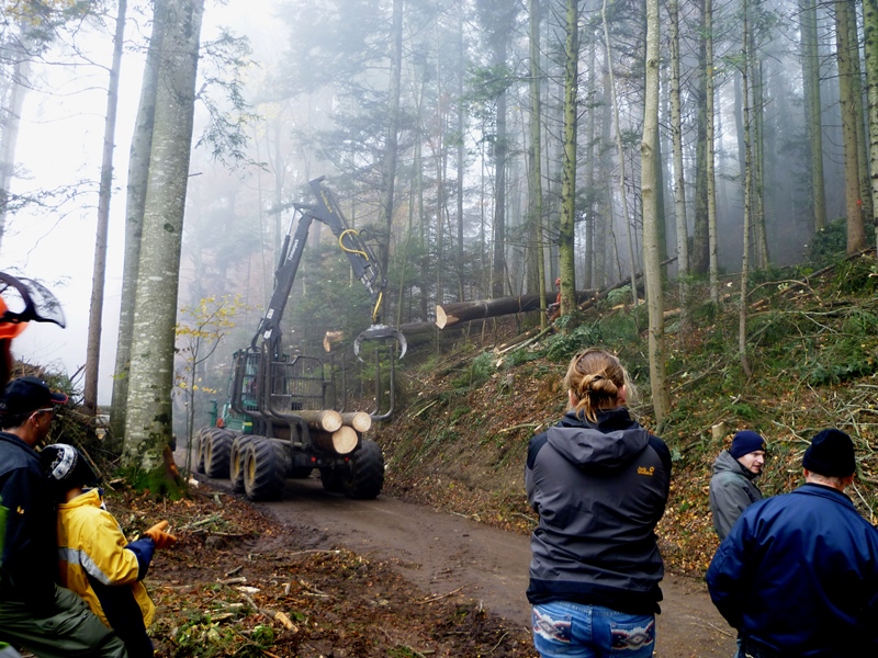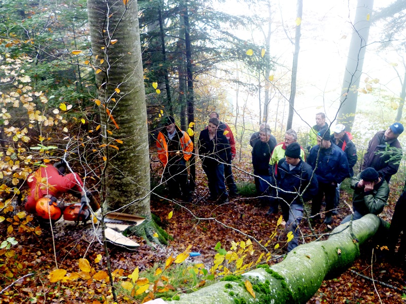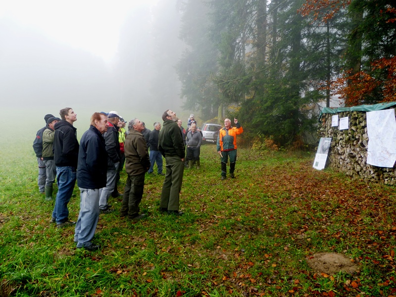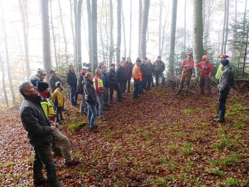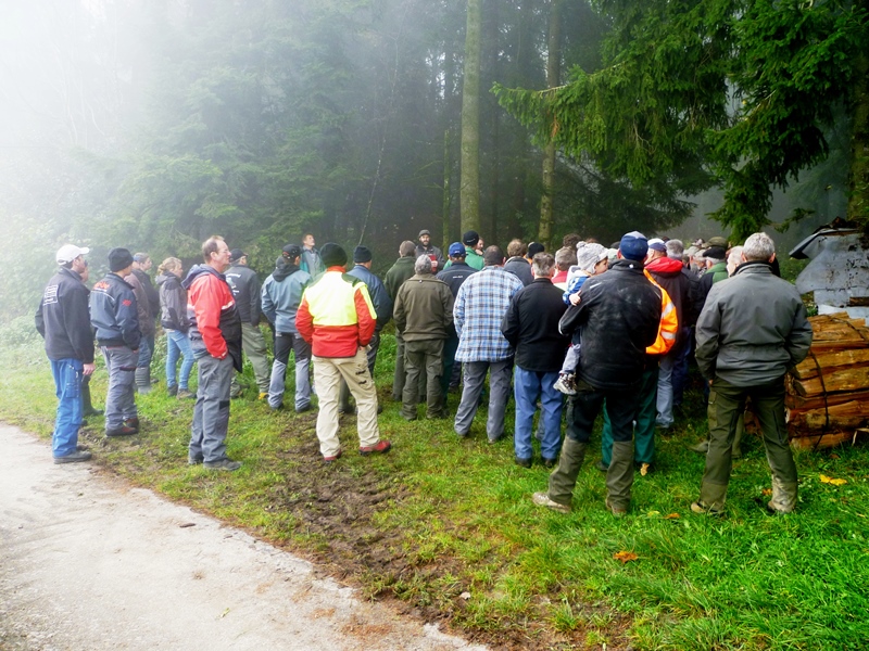 Nach der Begrüssung wurden in zwei Gruppen die vorbereiteten Posten besucht. Daniel Peter hat zusammen mit der Firma Birrer und Schwegler die Holzernte und den Holzmarkt thematisiert. Von Josef Schwizer (Revierförster lawa) und Martin Hafner wurde das Thema Schutzwald und die Vorarbeiten bis zum Holzschlag präsentiert.